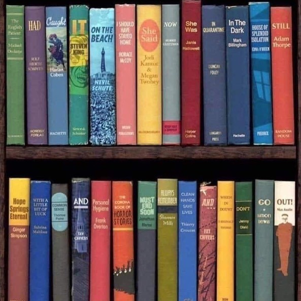 Another thing one can do when one has a lot of books—and surplus time—is play the “book-spine” challenge that is going around, wherein you stack books from your own library side-by-side so their titles combine to form a message for our times. I’d like to see Marie Kondo do this: